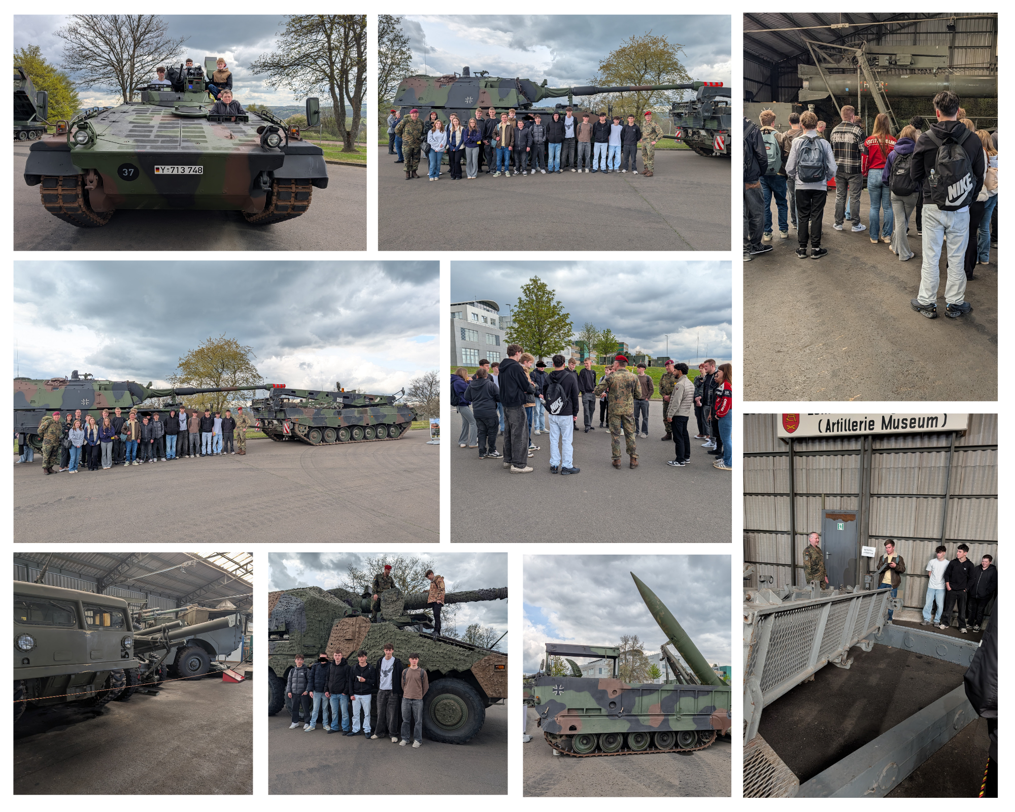 Unsere 9. Klässler hatten die besondere Gelegenheit, die Bundeswehr in Idar-Oberstein am „Tag des Fahnenjunkers“ zu besuchen. Vor Ort erhielten sie einen authentischen Einblick in den Alltag der Soldatinnen und Soldaten – von praktischen Übungen bis hin zu persönlichen Gesprächen mit den Auszubildenden.